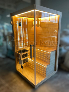 Это специально оборудованная готовая деревянная кабина для сухого и влажного парения. Электропечь нагревает пространство внутри и позволяет сбрызгивать камни водой, слегка увлажняя воздух. Такая процедура позволяет избежать перегрева. Каркас сауны выполнен из массива кедра, снаружи и внутри обшит липовой вагонкой сорта «Экстра» и имеет теплоизоляционный слой. Также двухуровневый полок идёт из кедра для обогащения внутри кабины полезными фитонцидами, а в сочетании с противовирусными свойствами липы сауна становится настоящим источником здоровья.