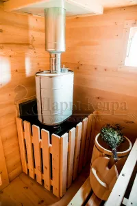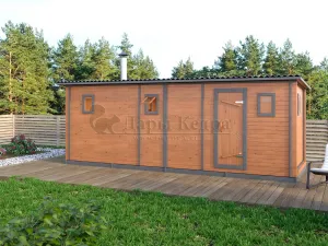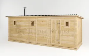 Это классическая прямоугольная модель бани с тремя отделениями: предбанником, моечной и парилкой. Для удобства пользования предбанник оснащен лавочкой и вешалкой. В моечной находится лавка и полочка из кедра. Парилка оборудована двухуровневым открытым полком и печью. Время растопки такой бани не превышает 30 минут. Каркасно-щитовую баню можно заказать как в готовом, так и в разборном варианте. В разборной модели готовые щиты из кедра быстро собираются в полноценное строение, что также позволяет исключить лишний строительный мусор. Такая баня не требует полноценный фундамент, поэтому при необходимости ее можно перенести в другое место.