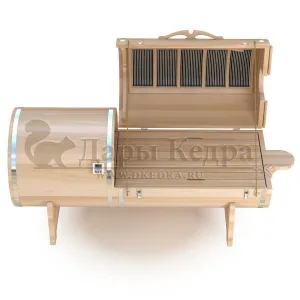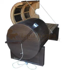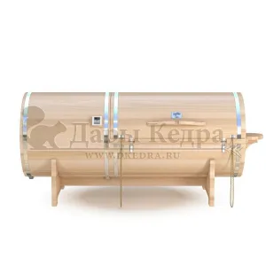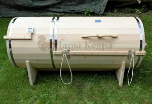 Горизонтальная двухрежимная фитобочка из кедра может быть использована как инфракрасная сауна и парная. Карбоновые излучатели отвечают за сухое парение и находятся на внутренней стороне дверцы. Влажное парение происходит за счет поступления горячего пара в фитобочку через паропровод. Горизонтальная форма позволяет принимать процедуры лежа. Внутренняя ручка из кедра облегчает открывание и закрывание двери во время парения. Такая модель наиболее удобна для оздоровительных центров.