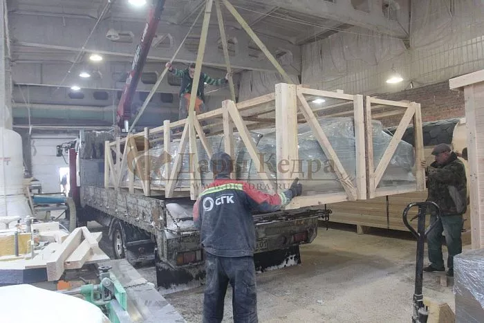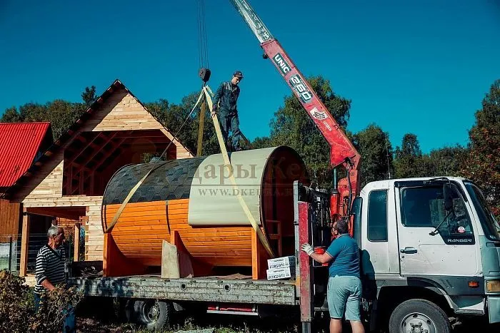 Сборный или разборный вид кедровой бочки доставляется на место установки непосредственно на манипуляторе (или длинномере с последующей разгрузкой манипулятором) и устанавливается на подготовленное заранее место. Для разобранной кедровой парной заранее изготавливается специальная обрешетка груза, которую требуется самостоятельно снять после выгрузки.