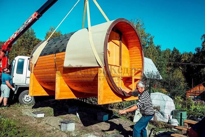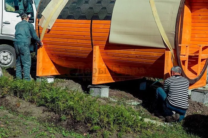 Любая баня-бочка является мобильной конструкцией, не требующей полноценного фундамента. О том, какое основание выбрать для кедровой парной мы рассказывали ранее в статье «Варианты фундамента для мобильной бани». Доставка такой банной конструкции может быть осуществлена в сборном или разборном виде. Причем необходимо обратить внимание на особенности разгрузки изделия, чтобы процесс был оперативным и качественным.