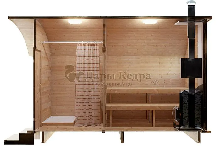 - Увеличенная высота потолков до 2,3 метра позволяет с комфортом париться даже очень высоким людям. В парилке длиной более 2 метров грамотно организовано помывочное место с установленным душевым поддоном. Повесив шторку на штангу, можно разграничить пространства и тем самым не мешать друг другу в одновременном принятии водно-банных процедур.