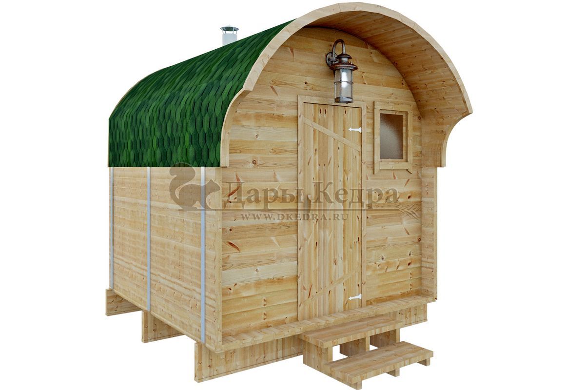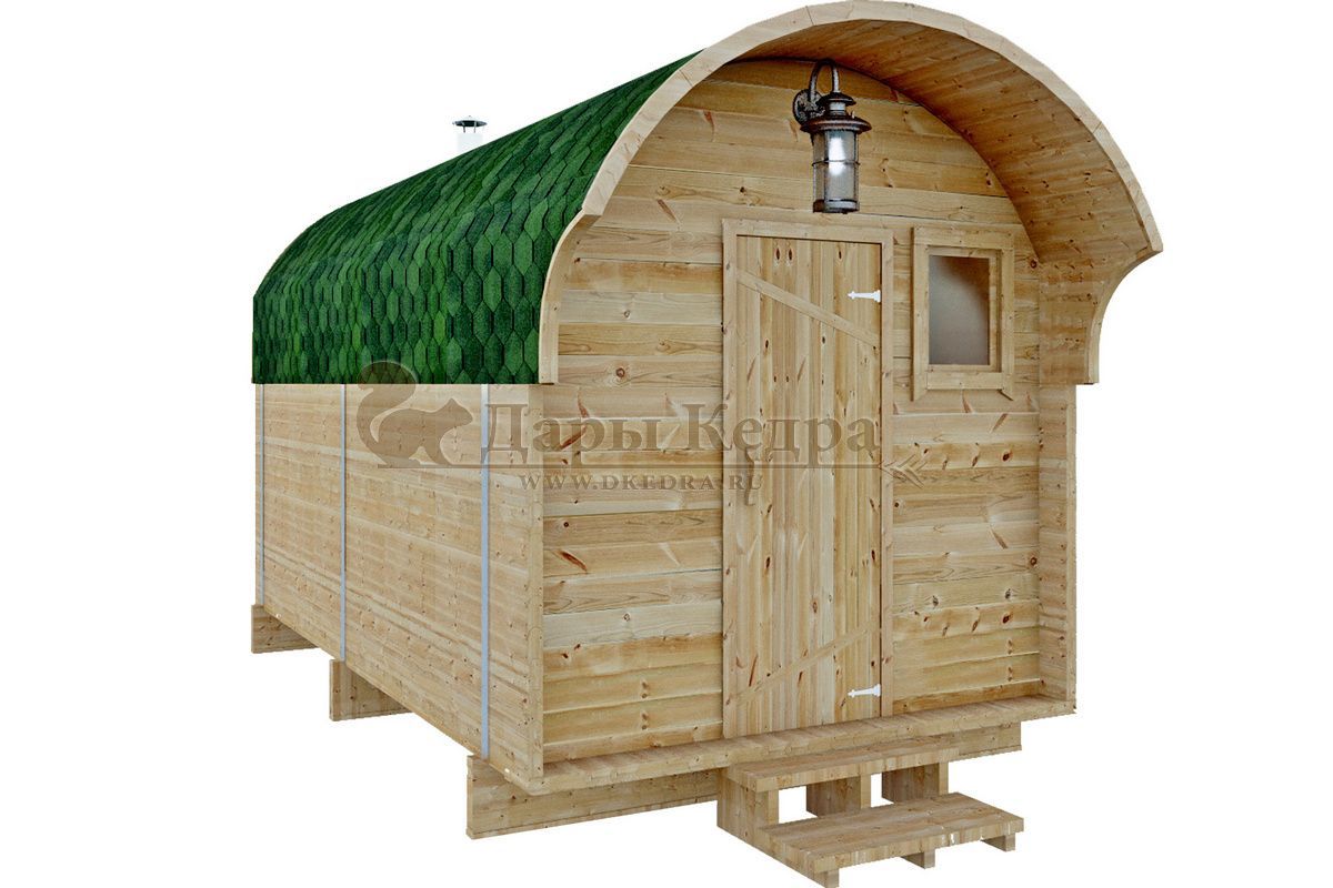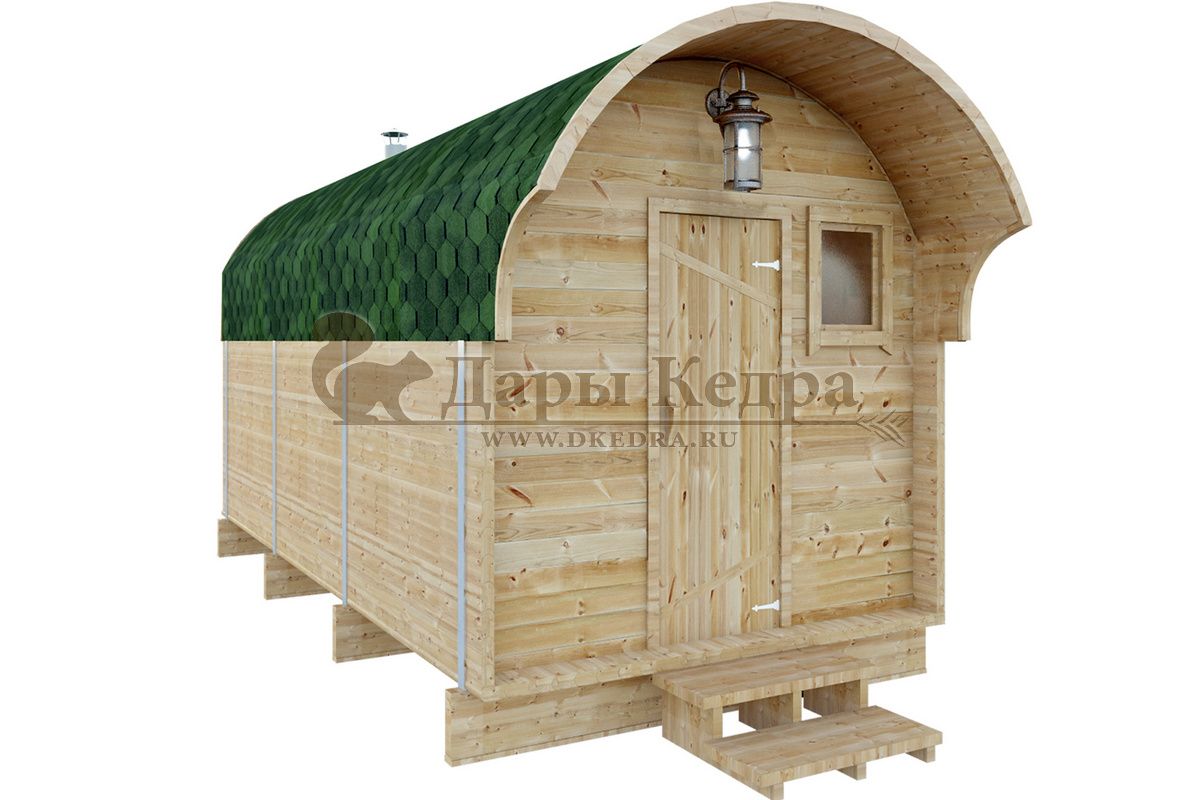 • Баня-бочка буханка из кедра с козырьком (все размеры) Баня-буханка более просторная за счет увеличенной высоты потолков и ровного пола. Козырек не только украшает баню, но и защищает оставленную обувь от дождя. Лавочки из кедра находятся по всей длине бани-бочки с обеих сторон. Печь расположена в парилке около дальней стены. Время растопки такой бани не превышает 30 минут. В зависимости от выбранного размера баня-бочка буханка с козырьком имеет следующую комплектацию: Баня-бочка буханка 2,5 метра - парилка; Баня-бочка буханка 3,5 и 4,5 метра - раздевалка, парилка; Баня-бочка буханка 5,5 метров - раздевалка, парилка, моечная. По вашему желанию ее можно укомплектовать печью с внешней загрузкой, благодаря которой весь мусор вовремя топки остается на улице. Баня-бочка буханка не требует полноценный фундамент, поэтому при необходимости ее можно перенести в другое место. Обращаем Ваше внимание, что в стандартную комплектацию бани входят полки открытого типа в парной с обеих сторон. Дополнительно можно заказать полок закрытого типа или лавку! Кедр обладает ароматическими свойствами. Он не деформируется и влагоустойчив, при правильном уходе за деревом на нем не развиваются грибки и плесень.