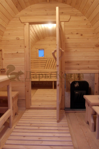 Это самая просторная модель бани. Благодаря этому ее можно использовать не только по назначению, но и в качестве летнего домика. Боковой вход у такой модели находится в начале или в середине конструкции. Моечная оснащена душевым поддоном. Двухуровневый открытый полок и лавочка в парилке сделает принятие процедур более комфортным. По вашему желанию баню-бочку можно дополнить печью с внешней загрузкой, благодаря которой весь мусор после топки останется на улице. Баня-бочка буханка из кедра с боковым входом не требует полноценный фундамент, поэтому при необходимости ее можно перенести в другое место.