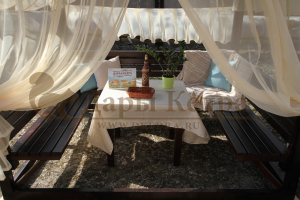 Беседка выполнена из кедра. На крыше - ондулин. Конструкция отличается простотой в установке, легкостью, долговечностью, прочностью и классическим дизайном, который впишется в любой интерьер приусадебного участка. Вокруг неё можно организовать ландшафт из вьющихся растений, которые красиво создадут зеленые "стены" снаружи и уют внутри.