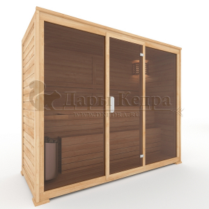 Это специально оборудованная готовая деревянная кабина для сухого и влажного парения. Электропечь нагревает пространство внутри и позволяет сбрызгивать камни водой, слегка увлажняя воздух. Такая процедура позволяет избежать перегрева. Сауна обшита снаружи и внутри кедровой вагонкой и имеет теплоизоляционный слой. Финская сауна с электропечью подойдет, как для домашнего использования, так и для коммерции. Доставляется в разборном виде щитами, собирается по инструкции с помощью шуруповёрта.