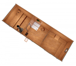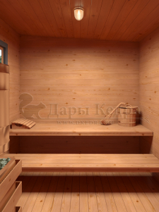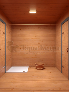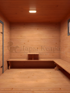 Это классическая прямоугольная модель бани с тремя отделениями: предбанником, моечной и парилкой. Для удобства пользования предбанник оснащен лавочкой и вешалкой. В моечной находится лавка и полочка из кедра. Парилка оборудована двухуровневым открытым полком и печью. Время растопки такой бани не превышает 30 минут. Каркасно-щитовую баню можно заказать как в готовом, так и в разборном варианте. В разборной модели готовые щиты из кедра быстро собираются в полноценное строение, что также позволяет исключить лишний строительный мусор. Такая баня не требует полноценный фундамент, поэтому при необходимости ее можно перенести в другое место.